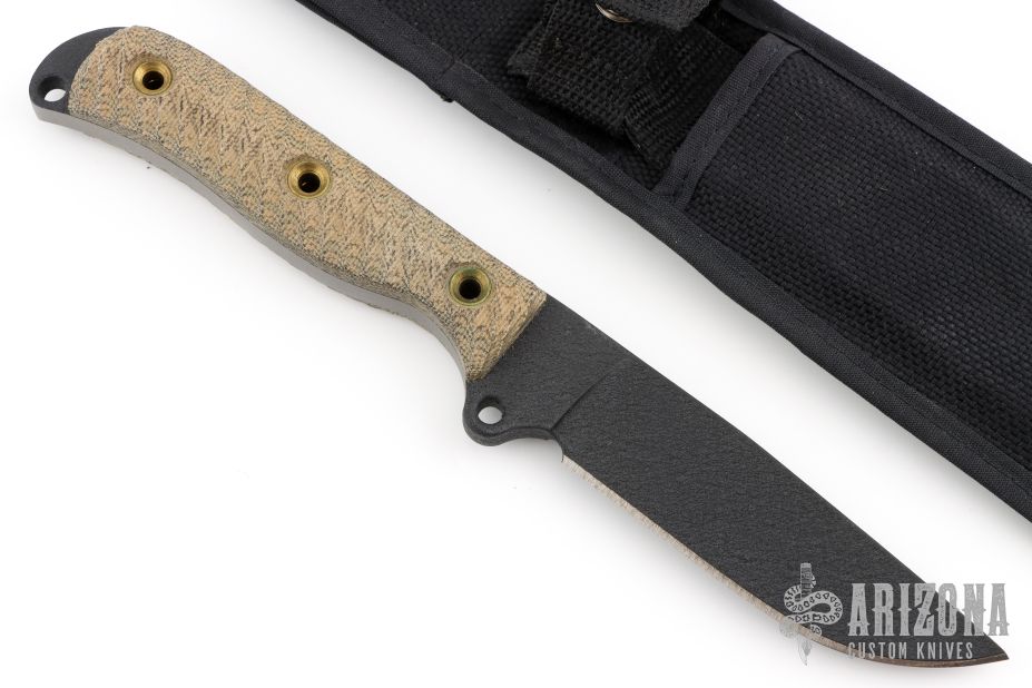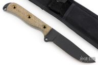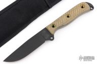 This SHSJ Satin Jack by Busse features a black coated drop point blade, .268" blade stock, 1.179" blade depth, full tang construction with textured micarta scales and a lanyard hole. Comes with a nylon belt sheath. Has some scuffs on the blade. Excellent condition otherwise.