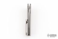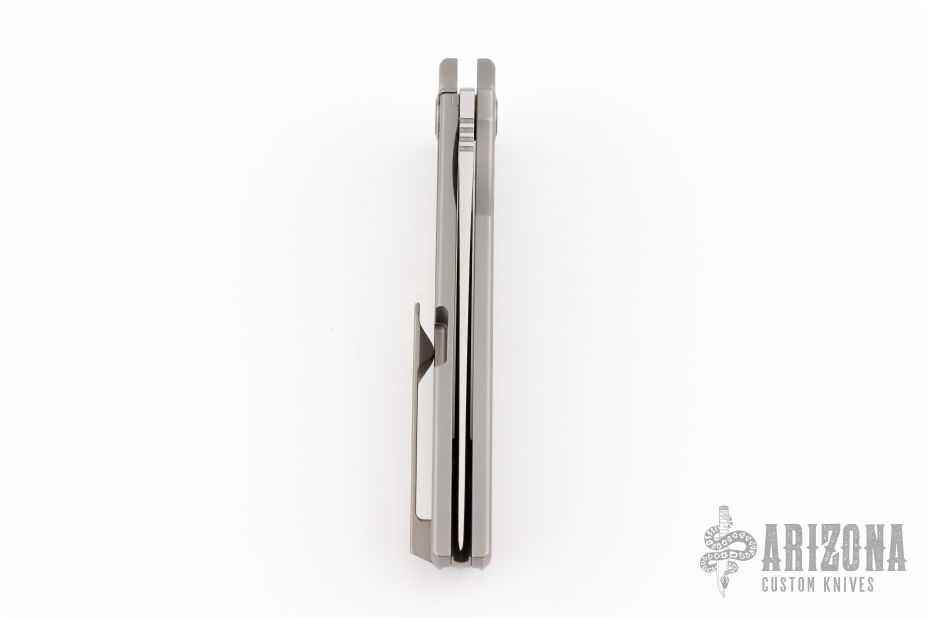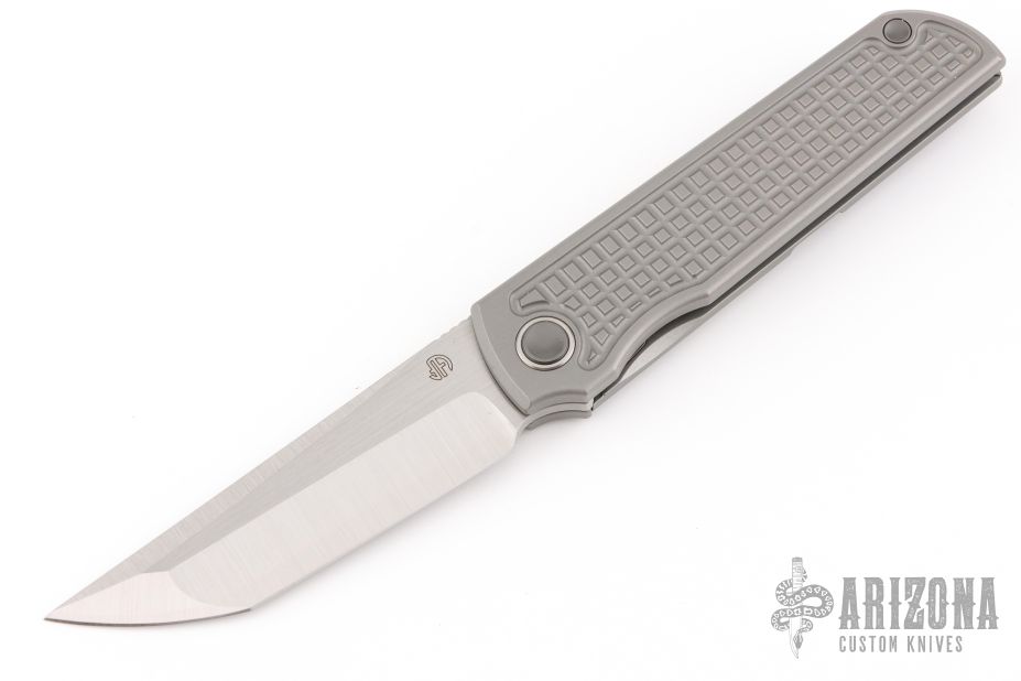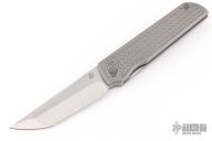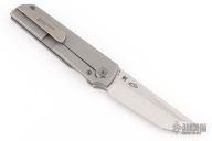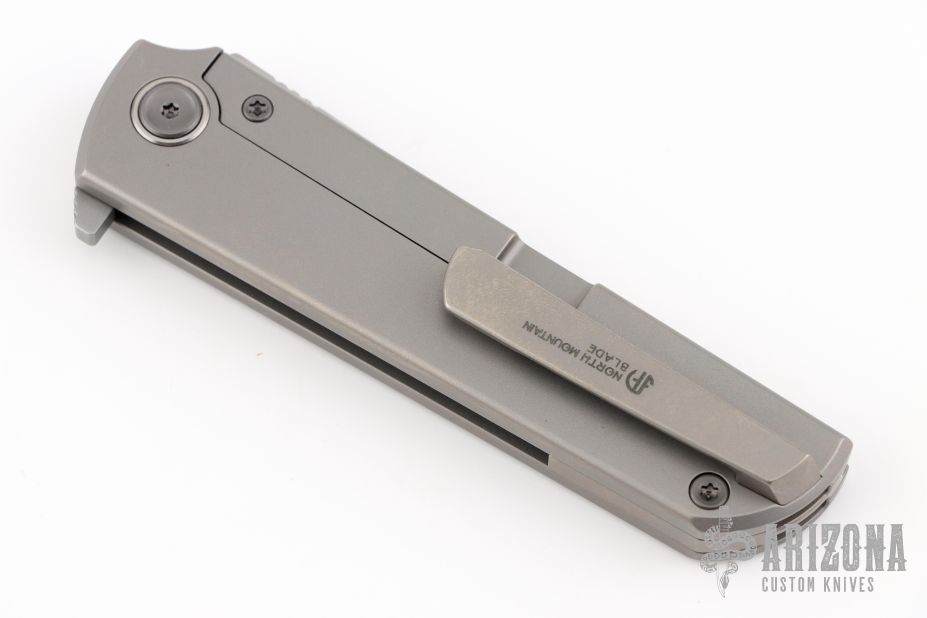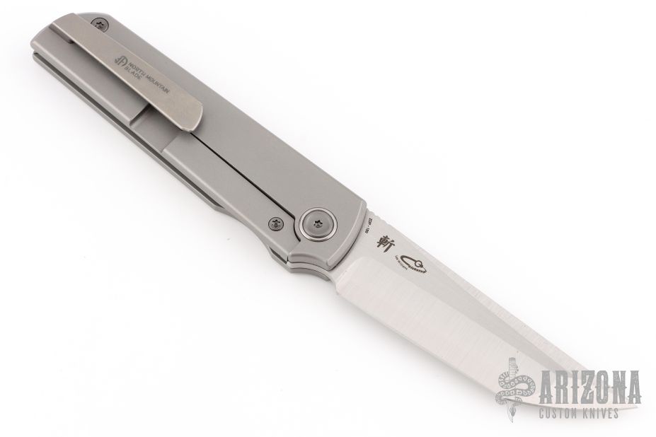 This Chop by North Mountain Blade features a satin finished ZDP-189 core San Mai blade with notched thumbrest and Lee Williams Kickstop flipper. The handle has a bead blasted titanium frame, tip up titanium clip and backspacer. Comes with original box, hard case and COA. New from maker.