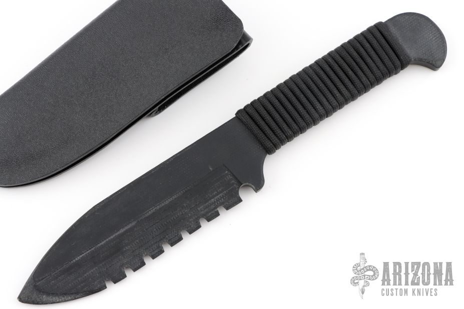 This rare Stealth Hawk fixed blade is made from a solid piece of black MP45. It has .267" blade stock and 1.39" blade depth. Handle is cord wrapped. Knife comes with a kydex sheath. Light scuffs are visible on the blade otherwise great condition.