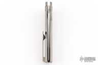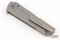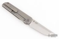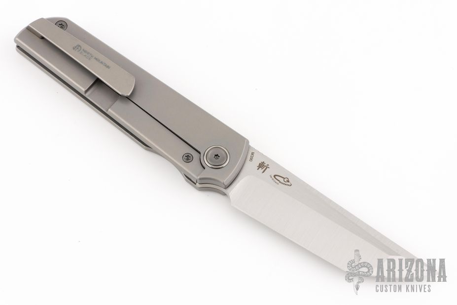 This Chop by North Mountain Blade features a satin finished blade with notched thumbrest and Lee Williams Kickstop flipper. The handle has a bead blasted titanium frame with tip up titanium clip and backspacer. Comes with original box, hard case and COA. New from maker.
