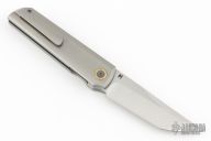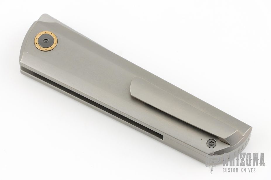 Design: Simplified with a single pivot screw for a sleek, minimalist aesthetic. The handle remains free of visible hardware, maintaining the CHOP series' iconic clean look. The brass pivot ring serves as the only accent, oxidizing naturally over time, enhancing the knife’s character. The hidden pocket clip adds to the knife’s streamlined appearance, and the quick-opening mechanism is preserved for easy use.