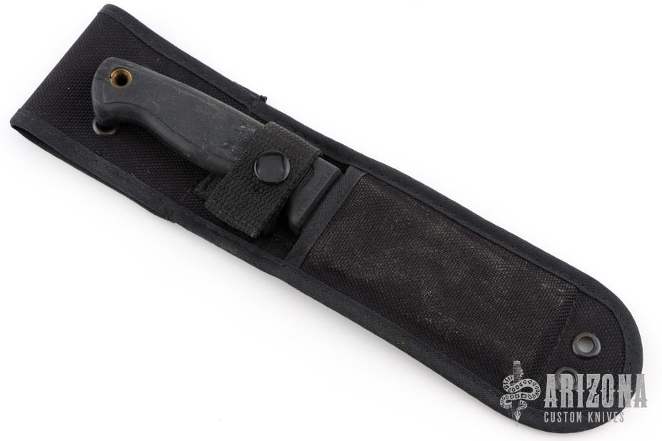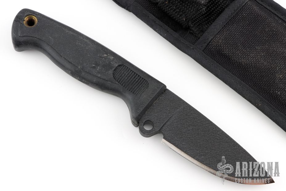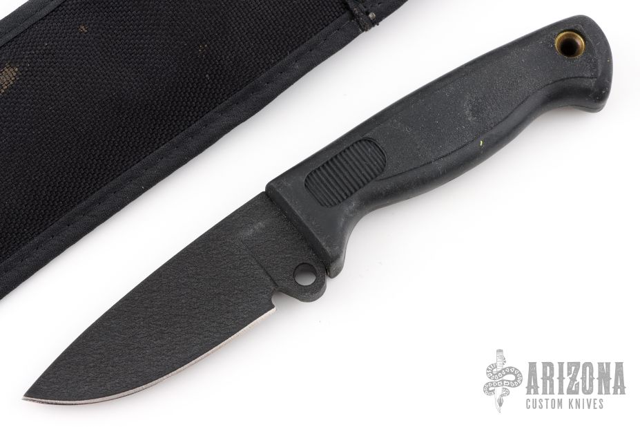 This Basic 3 by Busse Combat features a coated drop point blade, .262" bladestock and 1.246" blade depth, hidden tang construction. The handle is rubber with a lanyard hole. Comes with nylon belt sheath. Has some light scuffs, has been resharpened, great condition otherwise.