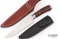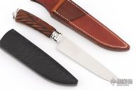 This is an elegant Gaucho Knife by Ritsu Maruyama can be completely taken apart and put back together with the screw on the butt. The blade is hand rub satin finished with .230" blade stock and 1.105" blade depth, hidden takedown tang construction. The handle has a mirror polished and fluted 303 stainless steel guard and butt, spiral fluted ironwood grip. Comes with a black leather sheath with black ostrich leg skin overlays, and a two-tone brown leather sheath. New condition. This knife is flawless! Comes with a brass COA dated 2/21/25