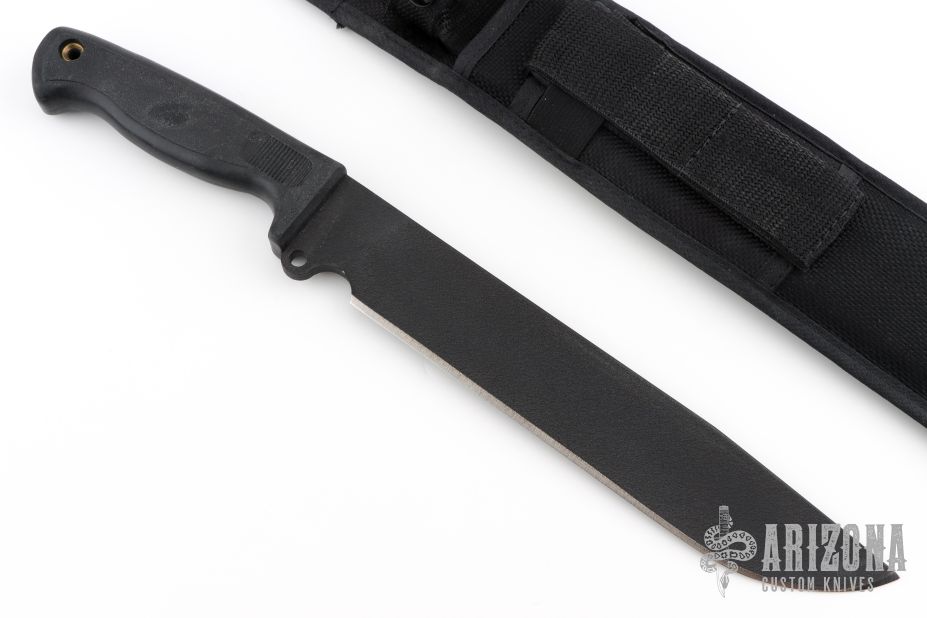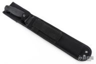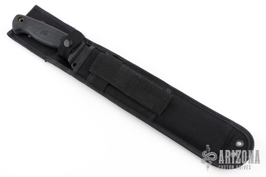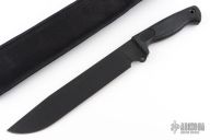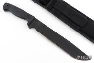 This Busse Basic 9 by Busse Combat has a black coated INFI steel drop point blade with hidden tang. Bladestock is .266", depth is 1.622". Handle is non-slip with lanyard hole. Comes with a black nylon sheath with belt loop. Has some light scuffs, otherwise Excellent condition.