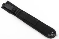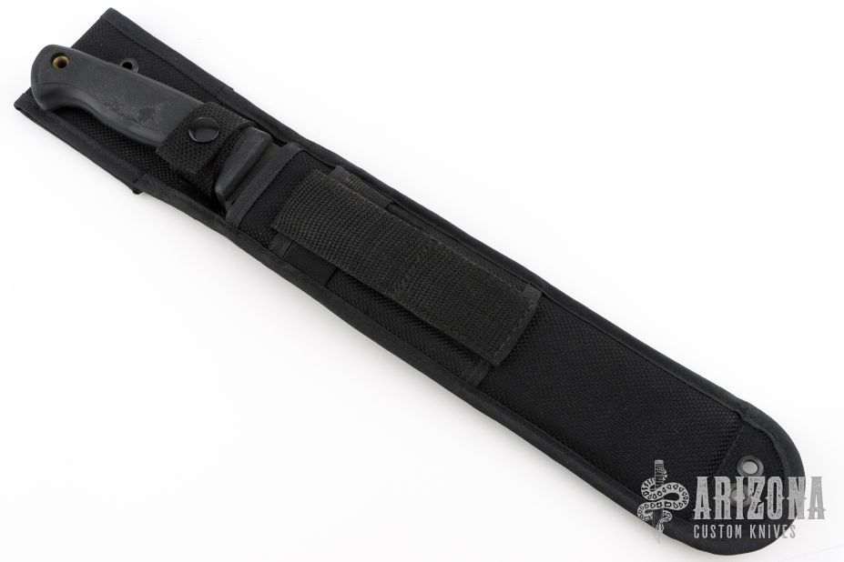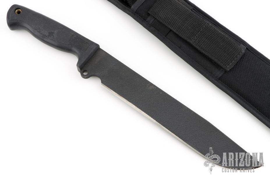 This Busse Basic 9 by Busse Combat has a black coated INFI steel drop point blade with hidden tang. Bladestock is .261", depth is 1.6". Handle is non-slip with lanyard hole. Comes with a black nylon sheath with belt loop. Has some light scuffs, otherwise Excellent condition.