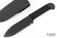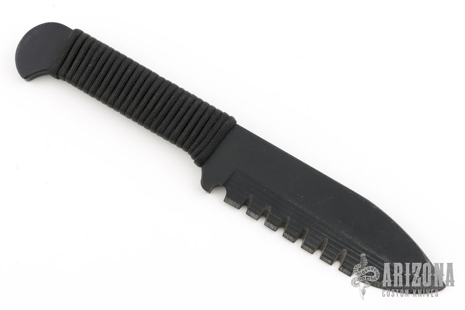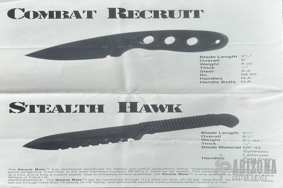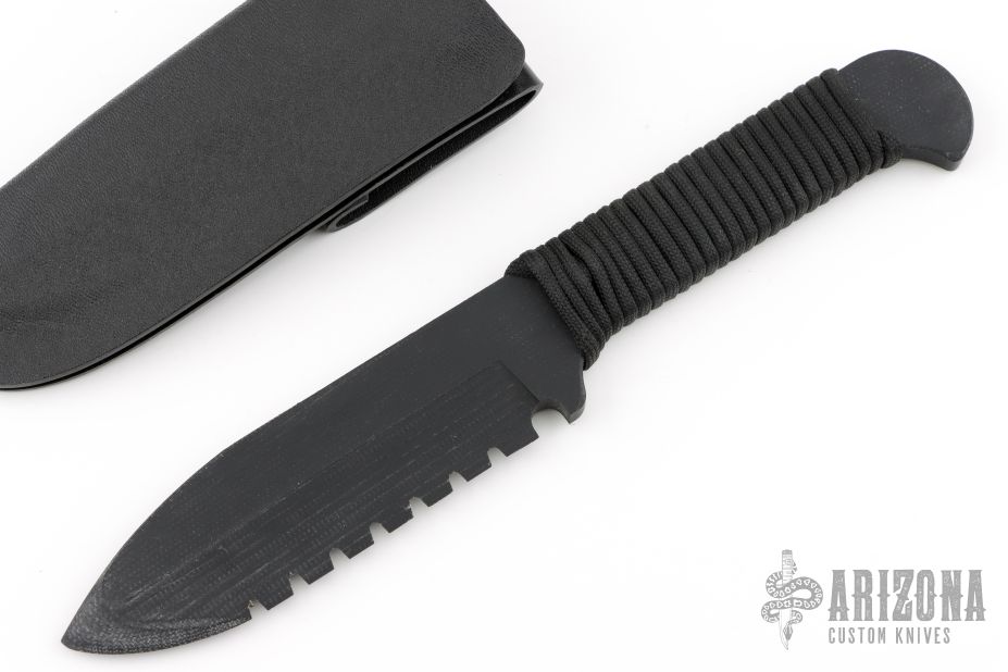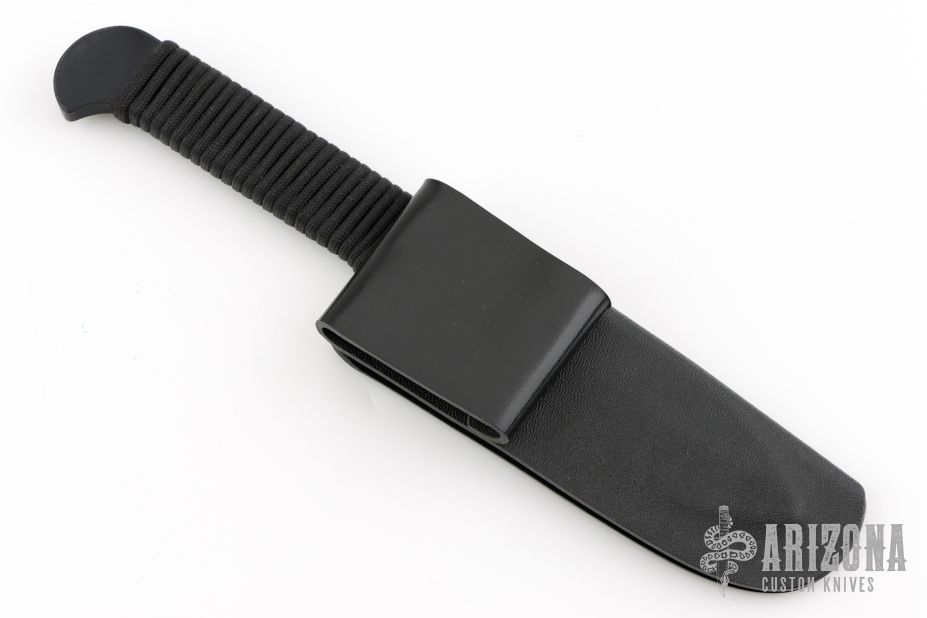 This rare Stealth Hawk fixed blade is made from a solid piece of black MP45. It has .267" blade stock and 1.375" blade depth. Handle is cord wrapped. Knife comes with a kydex sheath. Light scuffs are visible on the blade otherwise great condition.