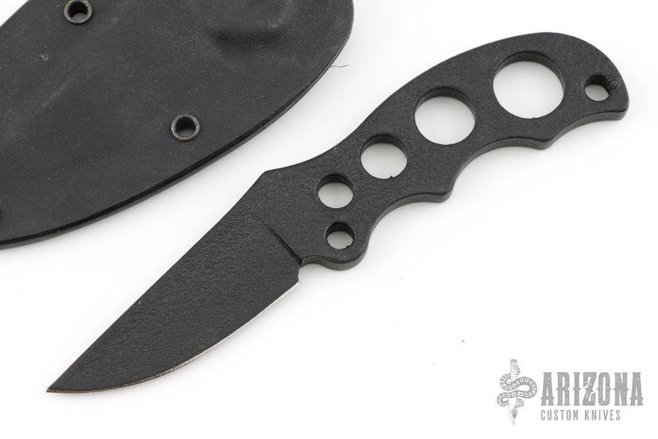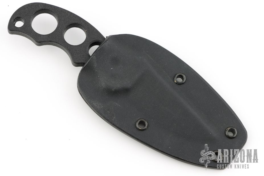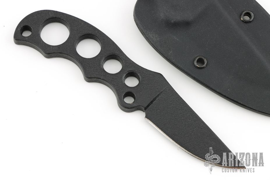 This Assault Shaker by Busse features a black coated clip point blade with .252" blade stock and .930" blade depth. The handle is skeletonized, with lanyard hole in pommel. Comes with a kydex sheath. Has some light scuffs, excellent condition otherwise.