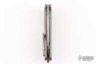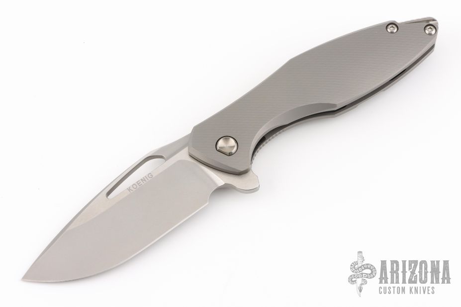 Koenig Arius titanium frame lock pocket knife features a M390 blade with bearing pivot for quick and smooth opening. Includes lightening pockets in the frame for weight reduction.
