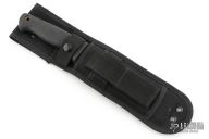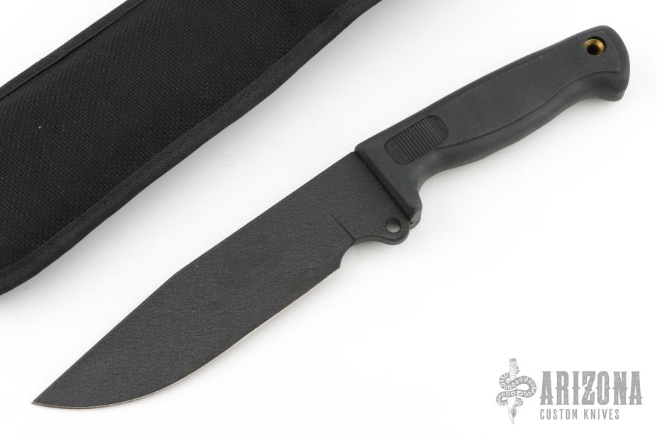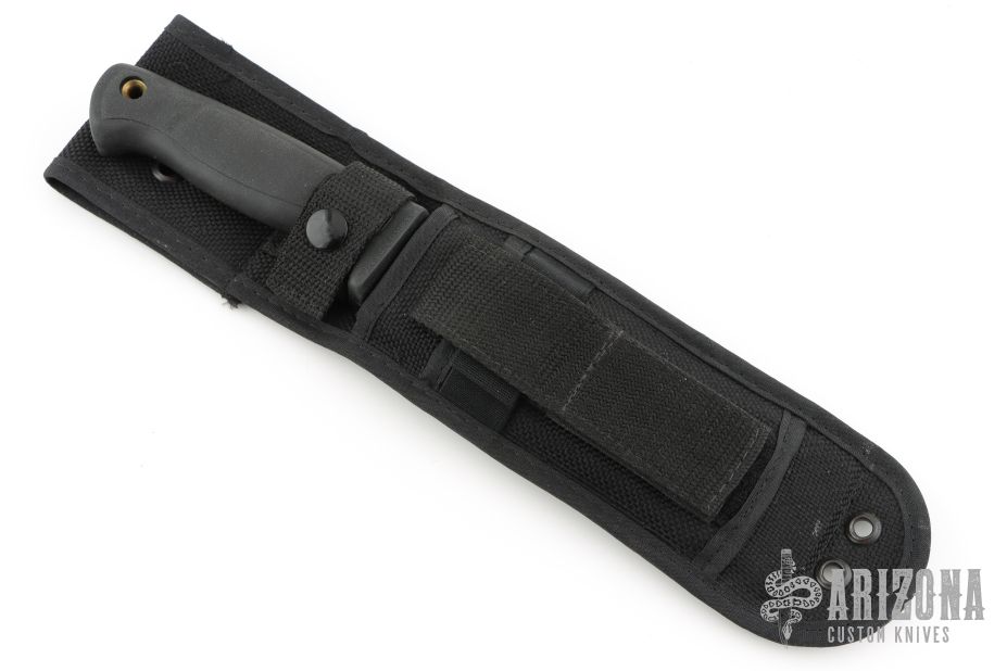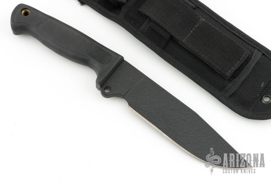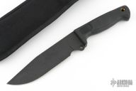This Busse German 6" by Busse Combat has a black coated INFI steel clip point blade with hidden tang. Bladestock is .27", depth is 1.583". Handle is non-slip with lanyard hole. Comes with a black nylon sheath with belt loop. Has some light scuffs, otherwise Excellent condition.