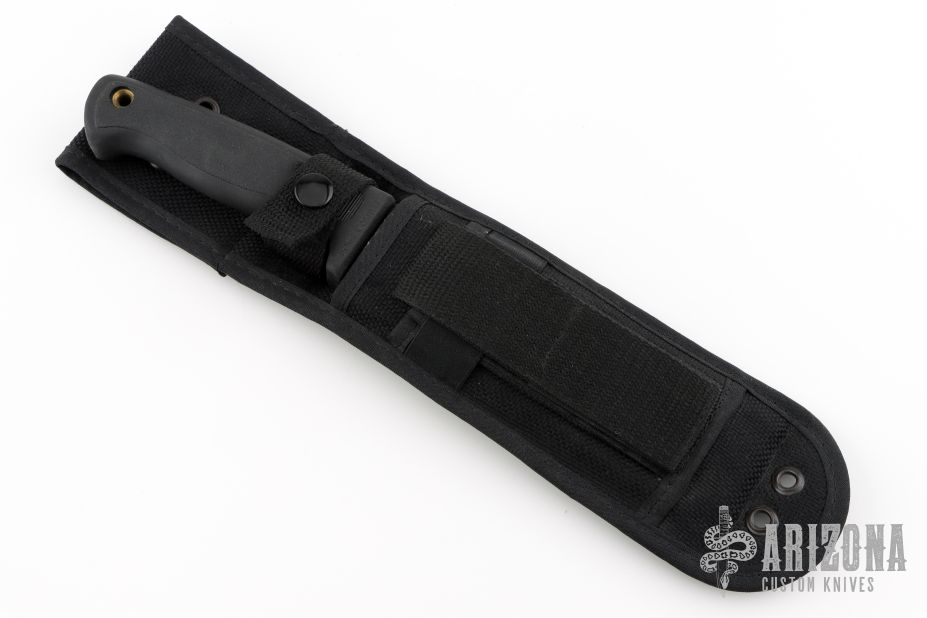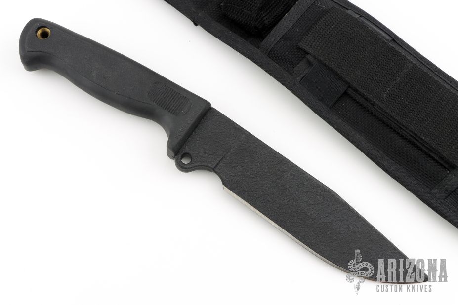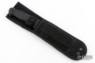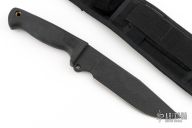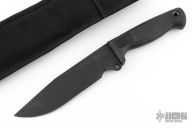 This Busse German 6" by Busse Combat has a black coated INFI steel clip point blade with hidden tang. Bladestock is .27", depth is 1.60". Handle is non-slip with lanyard hole. Comes with a black nylon sheath with belt loop. Has some light scuffs, otherwise Excellent condition.