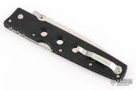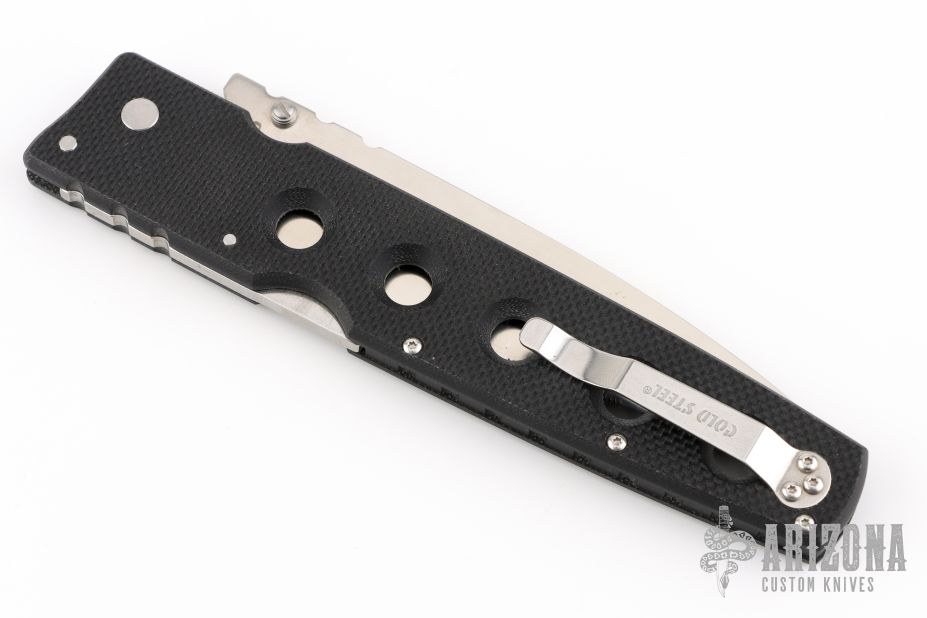 This Hold Out from Cold Steel features a satin finish spear point fully serrated blade with notched thumbrest and dual thumbstuds. The handle is comprised of black G-10 scales with stainless steel lock back. Tip up reversible stainless steel pocket clip. Includes original box. Excellent condition.