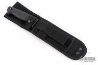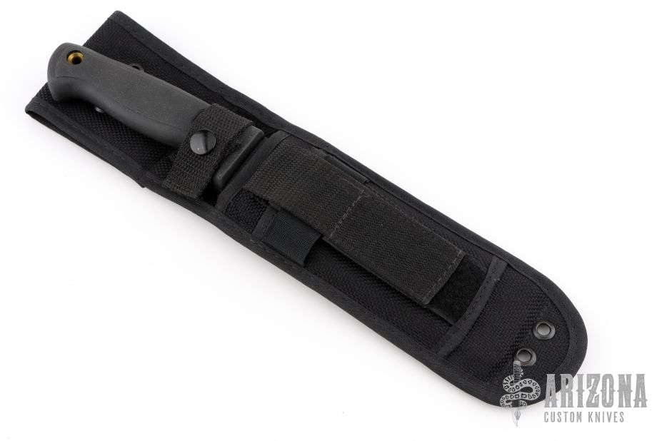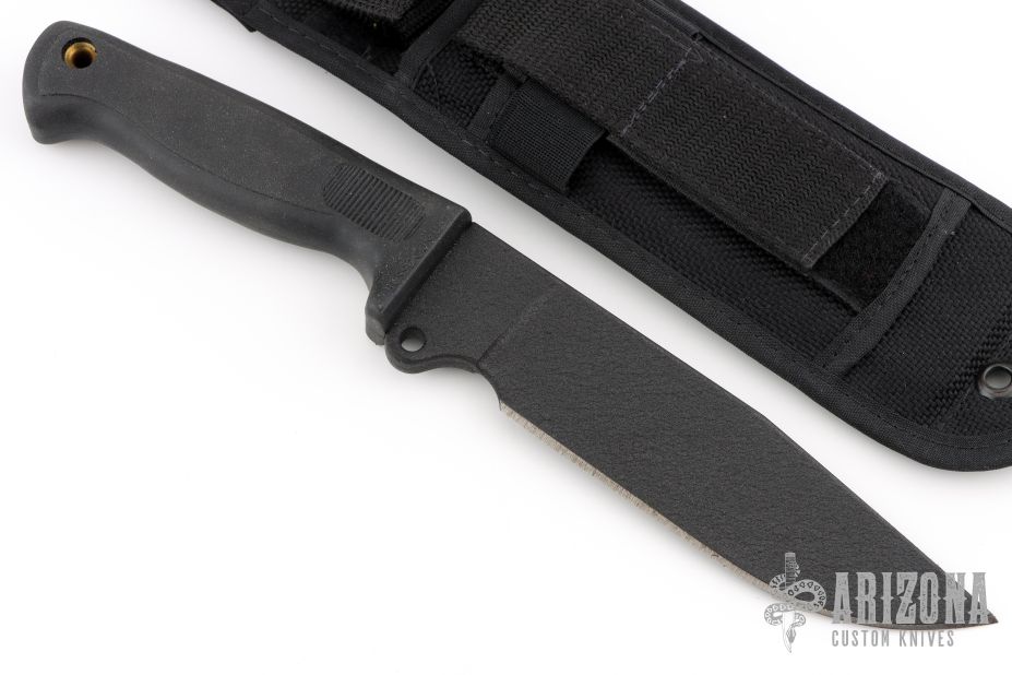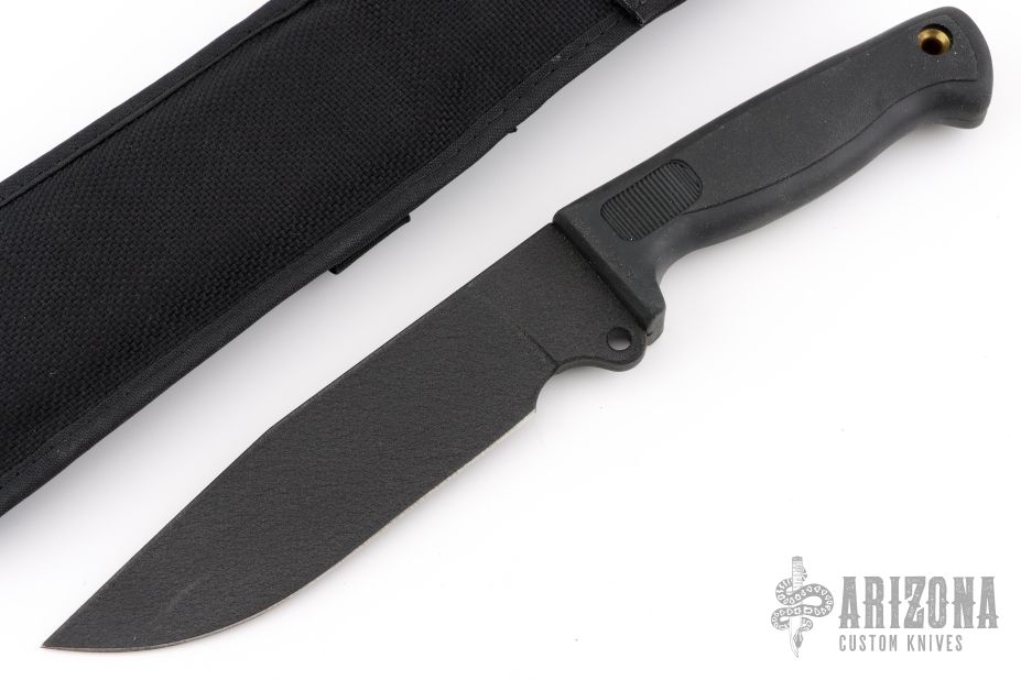 This Busse German 6" by Busse Combat has a black coated INFI steel clip point blade with hidden tang. Bladestock is .275", depth is 1.591". Handle is non-slip with lanyard hole. Comes with a black nylon sheath with belt loop. Has some light scuffs, otherwise Excellent condition.