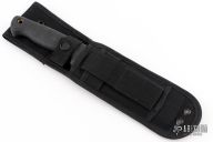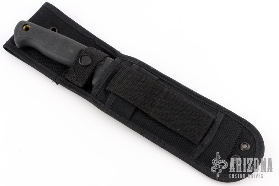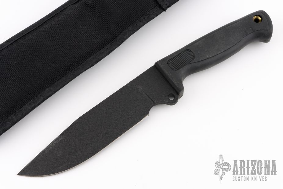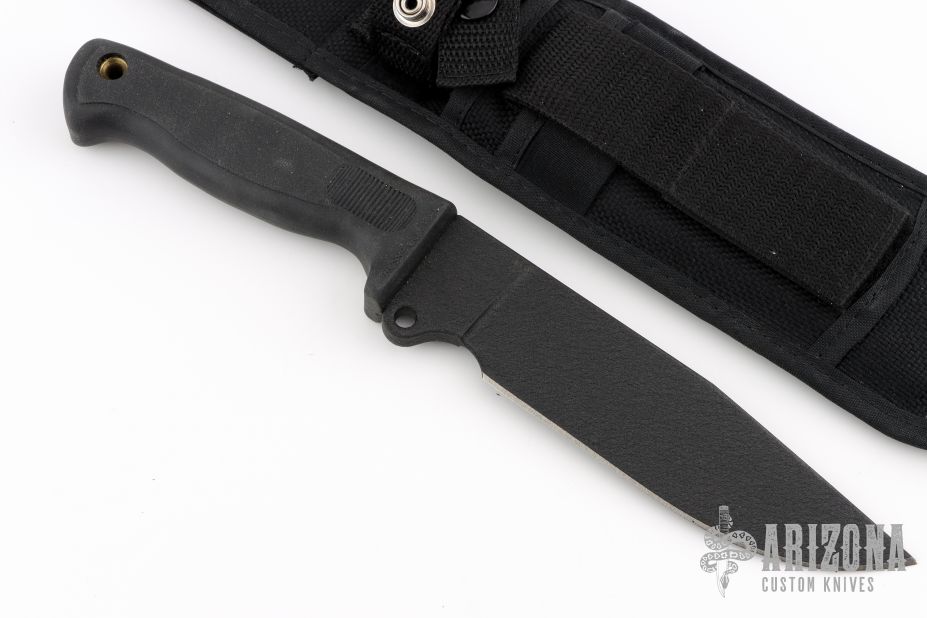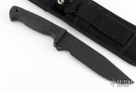 This Busse German 6" by Busse Combat has a black coated INFI steel clip point blade with hidden tang. Bladestock is .268", depth is 1.582". Handle is non-slip with lanyard hole. Comes with a black nylon sheath with belt loop. Has some light scuffs, otherwise Excellent condition.