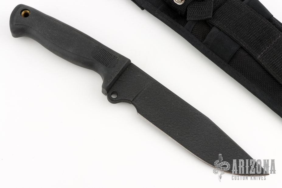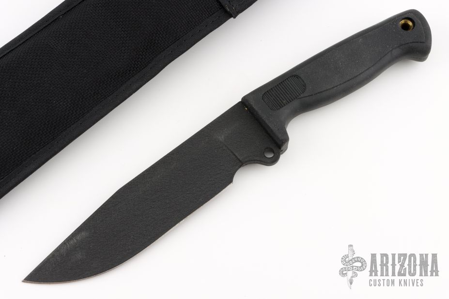 This Busse German 6" by Busse Combat has a black coated INFI steel clip point blade with hidden tang. Bladestock is .273", depth is 1.573". Handle is non-slip with lanyard hole. Comes with a black nylon sheath with belt loop. Has some light scuffs, otherwise Excellent condition.