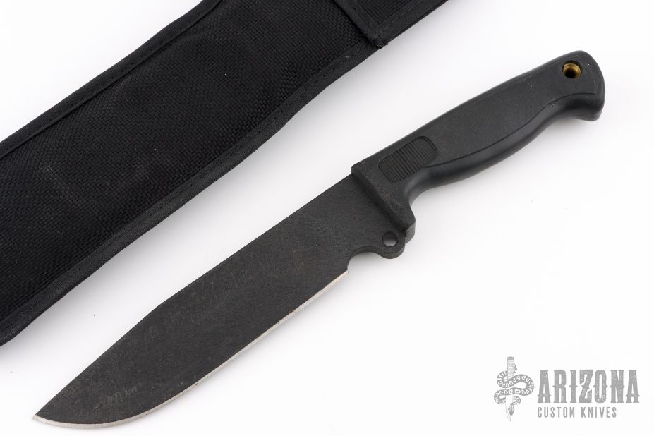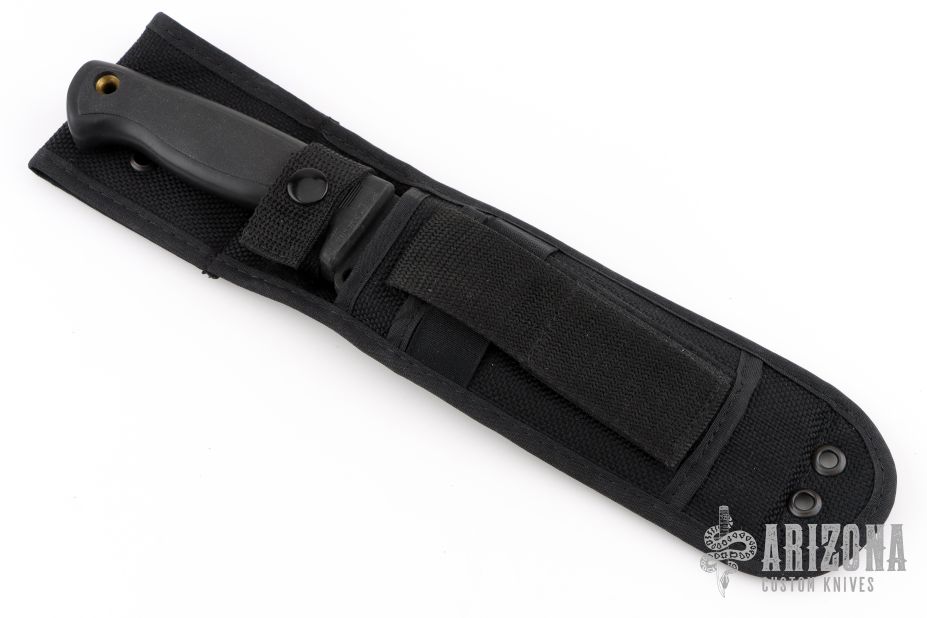 This Busse German 6" by Busse Combat has a black coated INFI steel clip point blade with hidden tang. Bladestock is .274", depth is 1.554". Handle is non-slip with lanyard hole. Comes with a black nylon sheath with belt loop. Has some light scuffs and scratches, otherwise great condition.