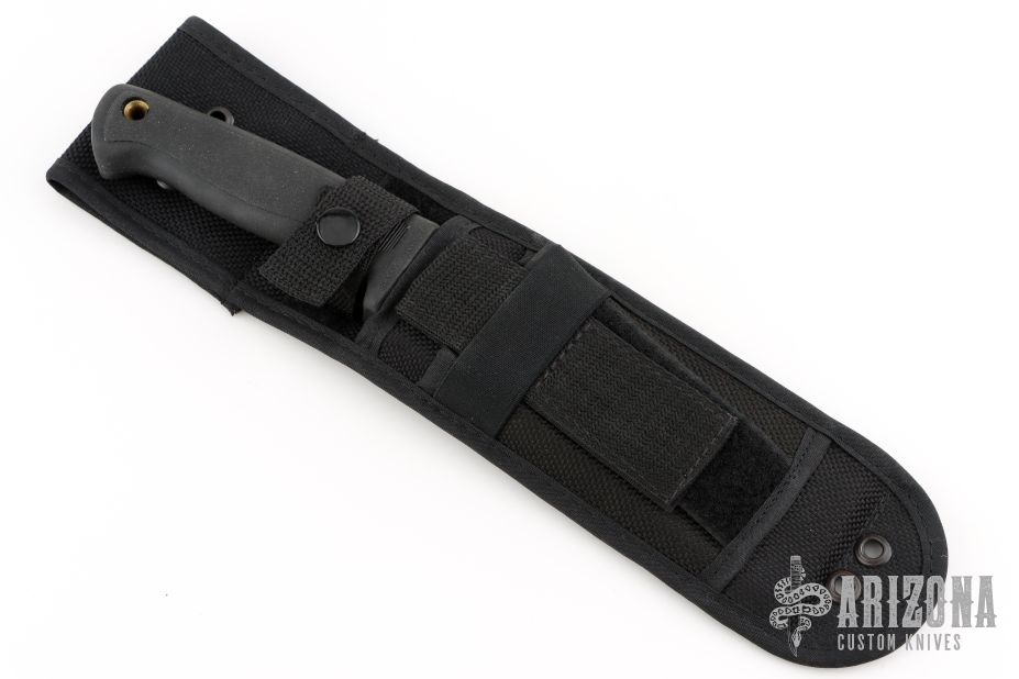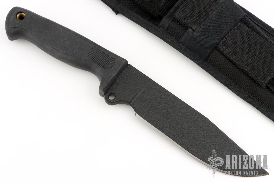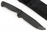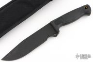This Busse German 6" by Busse Combat has a black coated INFI steel clip point blade with hidden tang. Bladestock is .277", depth is 1.588". Handle is non-slip with lanyard hole. Comes with a black nylon sheath with belt loop. Has some light scuffs, otherwise excellent condition.