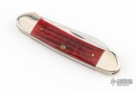 This Canoe 2-Blade Folder by Case Knives has polished stainless steel blades with nail nick(s). The handle has nickel silver bolsters and cap, red jigged bone covers, brass liners and stainless springs. Comes with original box and papers. Has a couple light scratches, otherwise excellent condition.