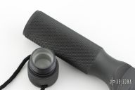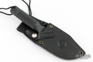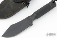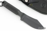 This Ubejane Skinner from Chris Reeve features a non reflective black finish with a clip point A2 blade with a false top edge and notched thumbrest, .204" blade stock and 1.685" blade depth, integral construction. The handle is knurled for a solid grip and has a removable butt cap with lanyard, has butt cap and storage area inside the handle. Comes with a black leather sheath, original box and papers dated October 31, 2000. Has a couple light scuffs, excellent condition otherwise.