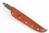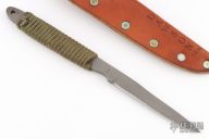 This knife by Barry Dawson features a bead blast finished spear point blade with false top edge, .249" blade stock and .513" Blade depth, full tang construction with cord wrapped handle. Comes with a brown leather sheath. Has a very light oxidation spot, otherwise excellent condition. "05" on the blade.