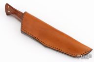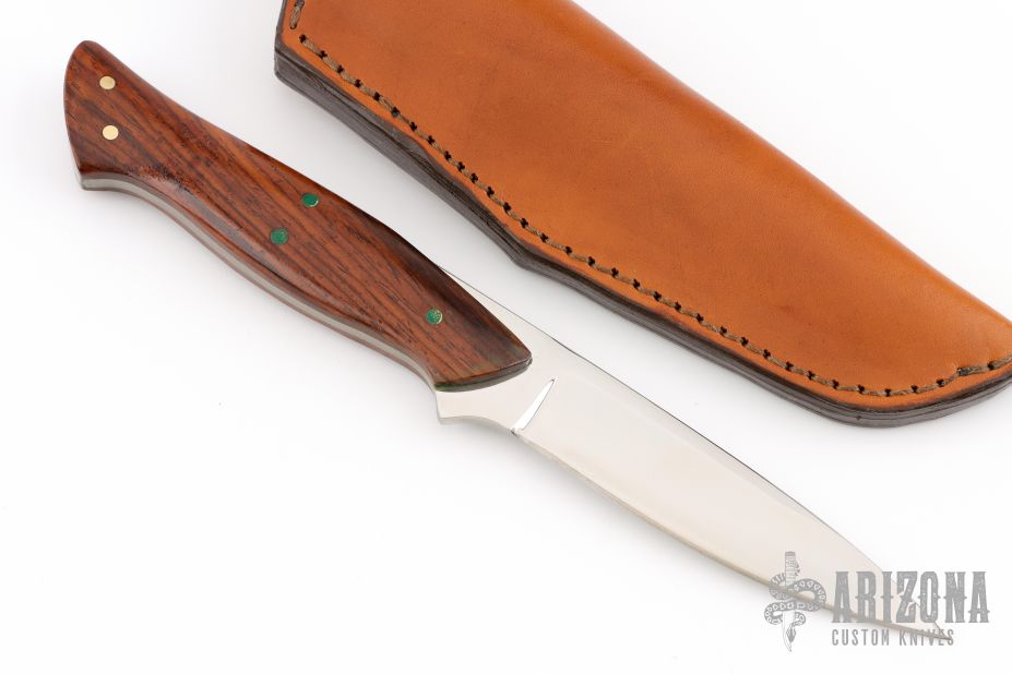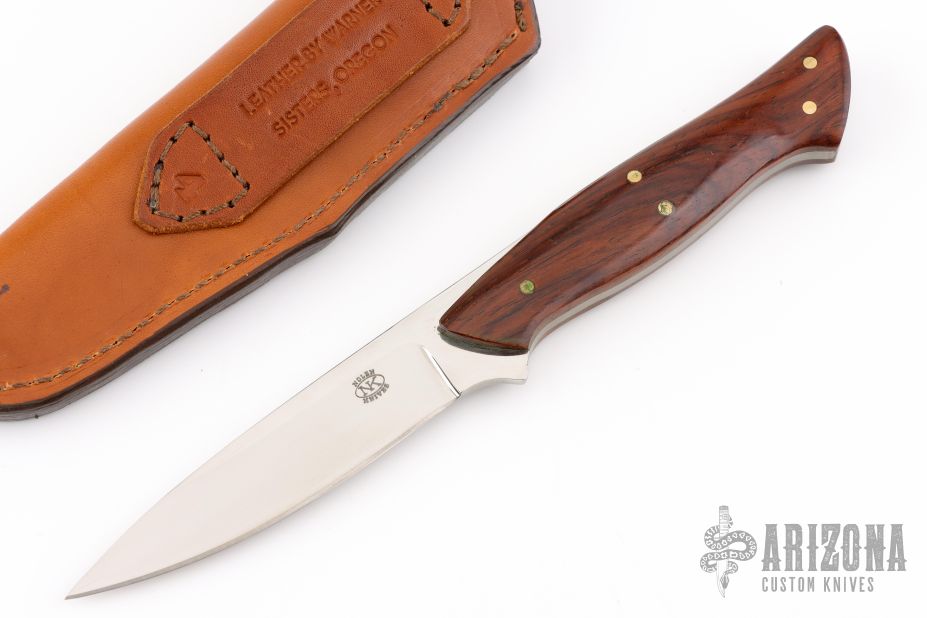 This knife by RD Nolen features a mirror finished blade with .130" blade stock and .878" blade depth, full tang construction. The handle has cocobolo scales with nickel silver pins. Comes with a brown leather sheath. Excellent condition.