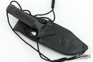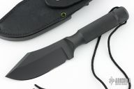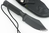 This Ubejane Skinner from Chris Reeve features a non reflective black finish with a clip point A2 blade with a false top edge and notched thumbrest, .209" blade stock and 1.691" blade depth, integral construction. The handle is knurled for a solid grip and has a removable butt cap with lanyard, has butt cap and storage area inside the handle. Comes with a black leather sheath, original box and papers dated October 20, 2000. Has a couple light scuffs, excellent condition otherwise.