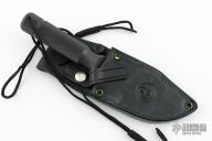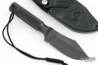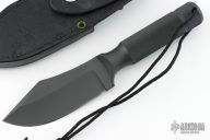 This Ubejane Skinner from Chris Reeve features a non reflective black finish with a clip point A2 blade with a false top edge and notched thumbrest, .209" blade stock and 1.691" blade depth, integral construction. The handle is knurled for a solid grip and has a removable butt cap with lanyard, has butt cap and storage area inside the handle. Comes with a black leather sheath, original box and papers dated October 31, 2000. Has a couple light scuffs, excellent condition otherwise.