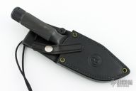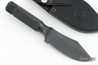 This Ubejane Skinner from Chris Reeve features a non reflective black finish with a clip point A2 blade with a false top edge and notched thumbrest, .209" blade stock and 1.691" blade depth, integral construction. The handle is knurled for a solid grip and has a removable butt cap with lanyard, has butt cap and storage area inside the handle. Comes with a black leather sheath, original box and papers dated October 21, 2000. Has a couple light scuffs, excellent condition otherwise.