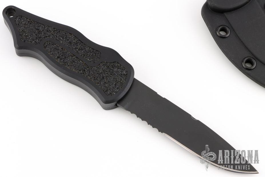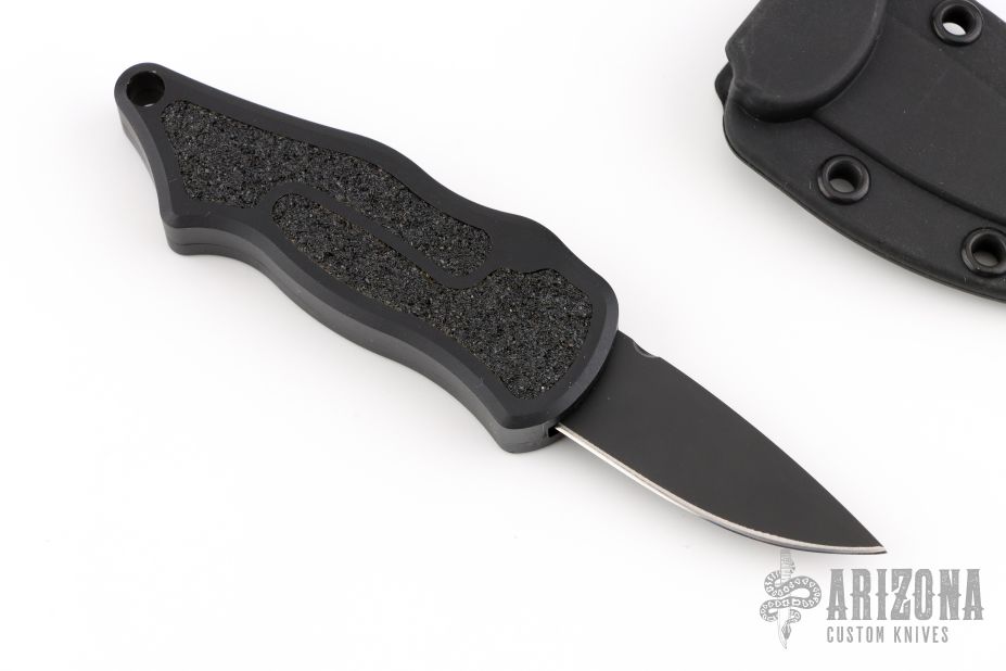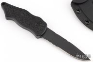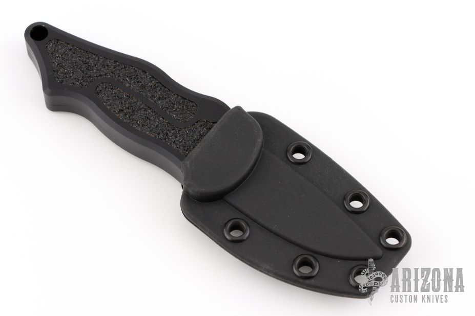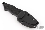 This Allen Elishewitz designed Phoenix neck knife features a black coated drop point blade with swedge that can be used with the blade at the 2" or 3.75" blade lengths. The handle features a push button lock that allows the user to select either size. That handle is comprised of aluminium with non slip inserts. Includes polymer sheath with clip. Comes with original box and papers. Has a couple light scuffs, otherwise Excellent condition.