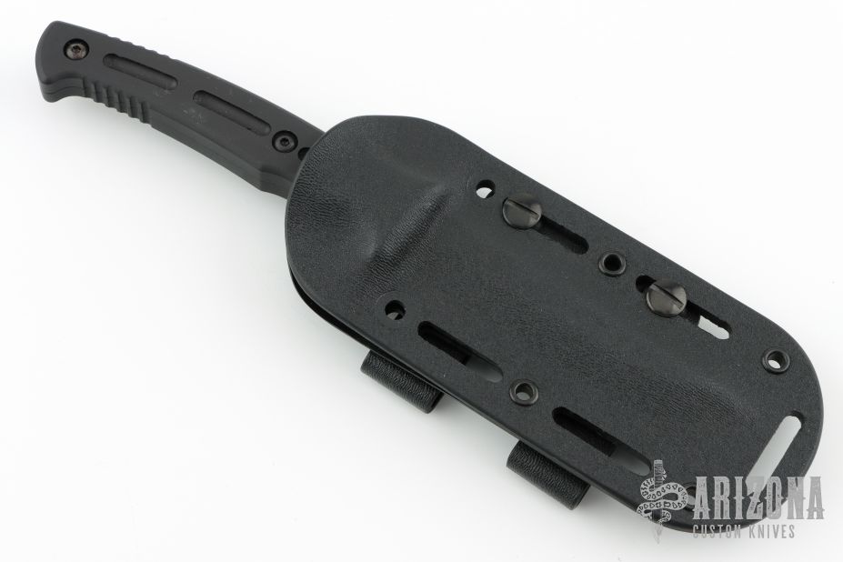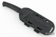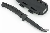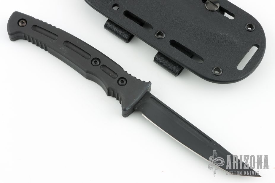 This Massad Ayoob "Razorback" by Masters of Defense has a black coated tanto blade with fullers, .176" blade stock and .637" blade depth, hidden tang construction. The handle is black coated aluminum. Comes with original box, papers, and black kydex sheath with belt clip. Excellent condition.