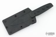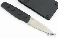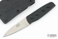 This is a Bud Nealy designed utility spear point with hidden tang construction and a blade thickness of 1/8", depth of 7/8". Handle is non-slip polymer with circular designs. Versatile Kydex carry system allows for belt, boot and neck carry. Comes with original box, papers, sheath, and ball chain. Excellent condition.