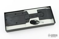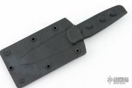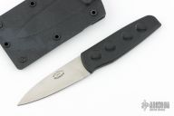 This is a Bud Nealy designed utility spear point with hidden tang construction and a blade thickness of 1/8", depth of 7/8". Handle is non-slip polymer with circular designs. Versatile Kydex carry system allows for belt, boot and neck carry. Comes with original box, papers, sheath, and ball chain. Excellent condition.