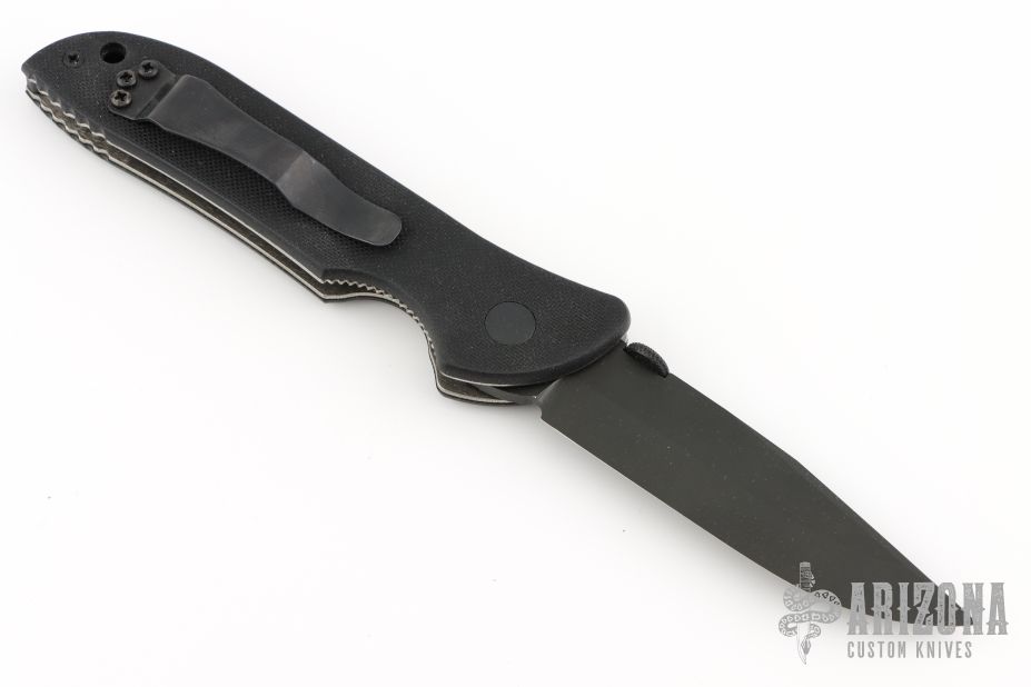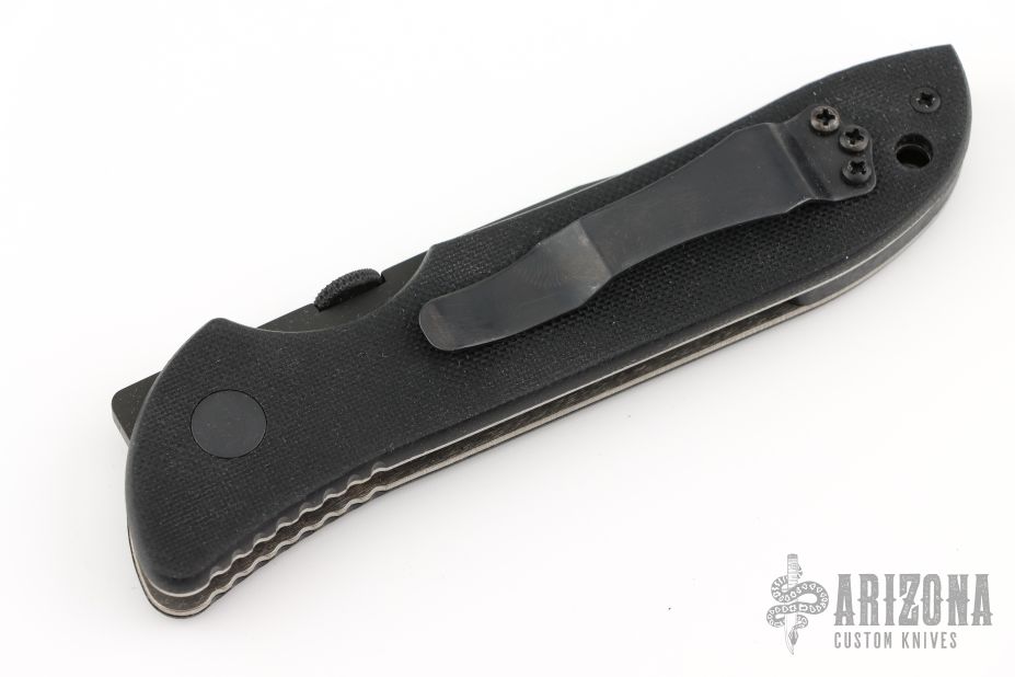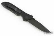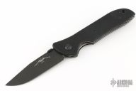 This Blackbird by Emerson knives features a black clip point blade with thumbdisc. The handle has black g10 covers, titanium liners, black backspacer, lanyard hole in pommel, and a black stainless steel tip up clip. Nice lockup and blade seating. Dated 2001. Comes with original box. Has some light scuffs, excellent condition otherwise.