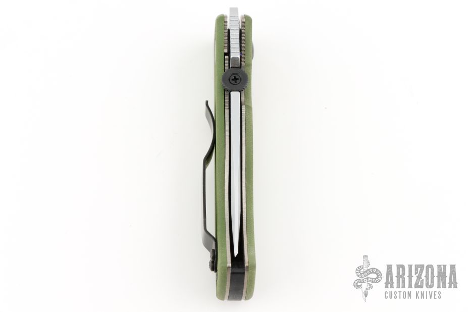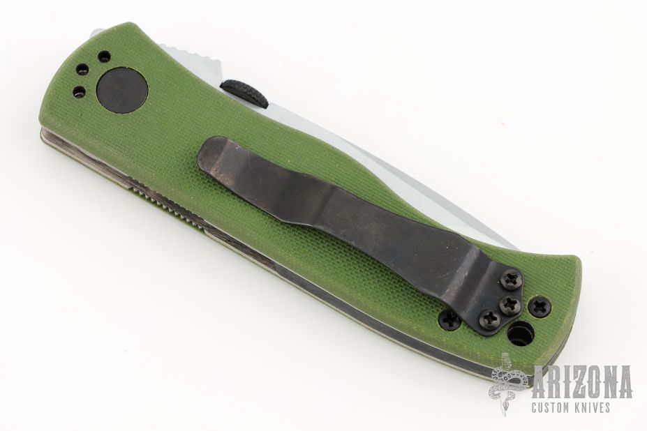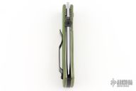 This production Mini CQC-7A has a silver finished blade with notched thumbrest and thumbdisc. The handle has green G-10 scales, titanium liners, tip up black stainless clip, lanyard hole.  Dated 2002 and #904. Comes with original box and papers. Has a couple light scuffs, otherwise Excellent condition.