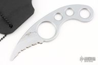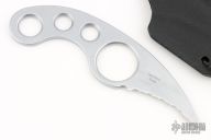 This La Griffe by Emerson Knives features a stonewashed chisel ground fully serrated blade with blunt tip. The handle is skeletonized for a lighter overall weight. This knife was designed by Fred Perrin. Comes with original sheath, box and papers. Has some scuffs and scratches. Excellent condition.