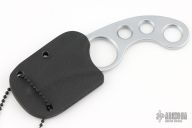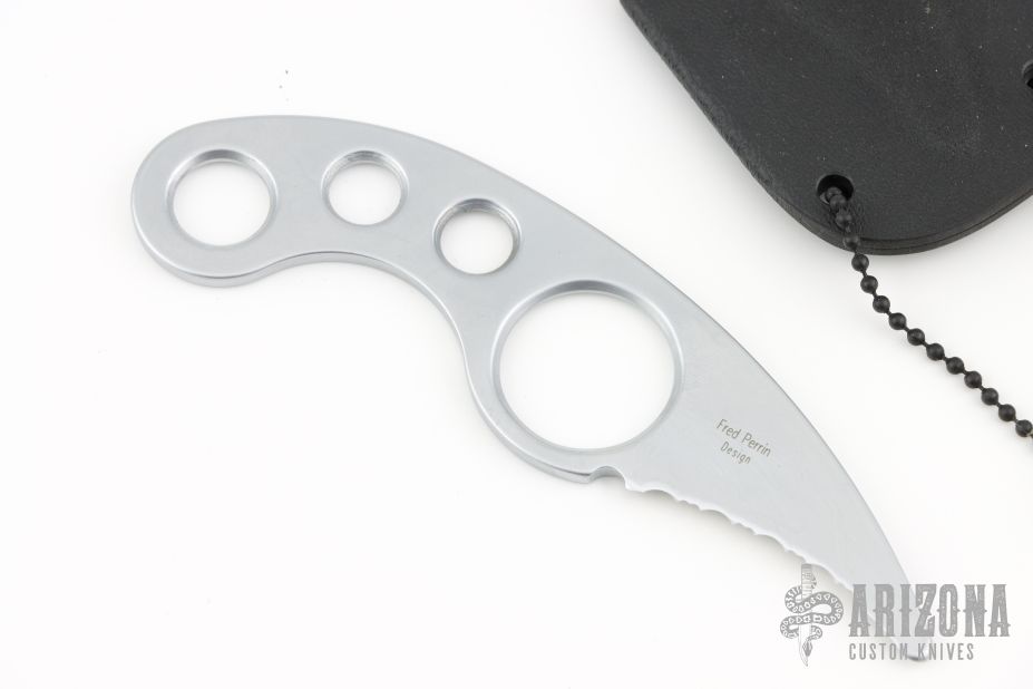 This La Griffe by Emerson Knives features a stonewashed chisel ground fully serrated blade with blunt tip. The handle is skeletonized for a lighter overall weight. This knife was designed by Fred Perrin. Comes with original sheath, box and papers. Has some scuffs and scratches. Excellent condition.
