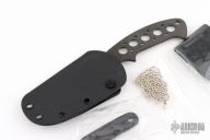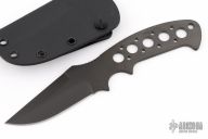 This Kasper Neck Knife from Pat and Wes Crawford features a black DLC finished clip point blade with swedge. Notched thumb rest and deep choil provide a solid grip, .126" blade stock and 1.280" blade depth. Handle has been drilled to reduce weight for ease of carry. Comes with a Kydex sheath and ball chain. New from maker!