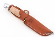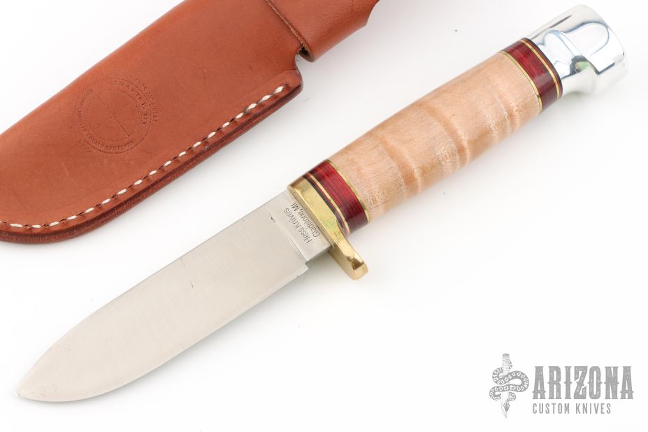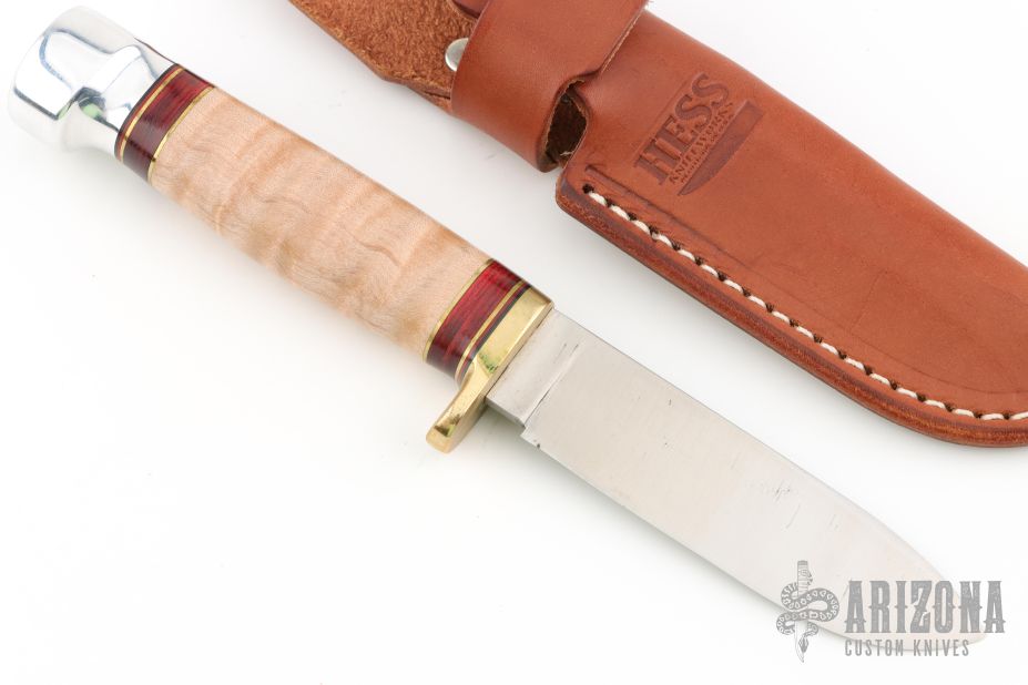 This knife by Hess Knives features a satin finished drop point blade, .122" blade stock and .994" blade depth, hidden tang construction. The handle has a brass guard, aluminum butt, curly maple wood handle with black/red/brass/wood spacers. Comes with a brown leather sheath and the original box. Has a couple light spots on the blade, otherwise excellent condition.
