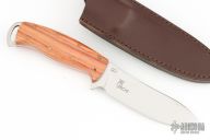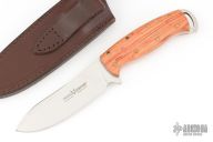The Persian Hunter fixed blade by Fox Cutlery features a satin finished drop point blade with notched thumbrest, .157" blade stock and 1.236" blade depth, full tang construction. The handle has Tulip wood scales with brass pins. Includes a leather sheath for belt carry. Comes with original box. Excellent condition.