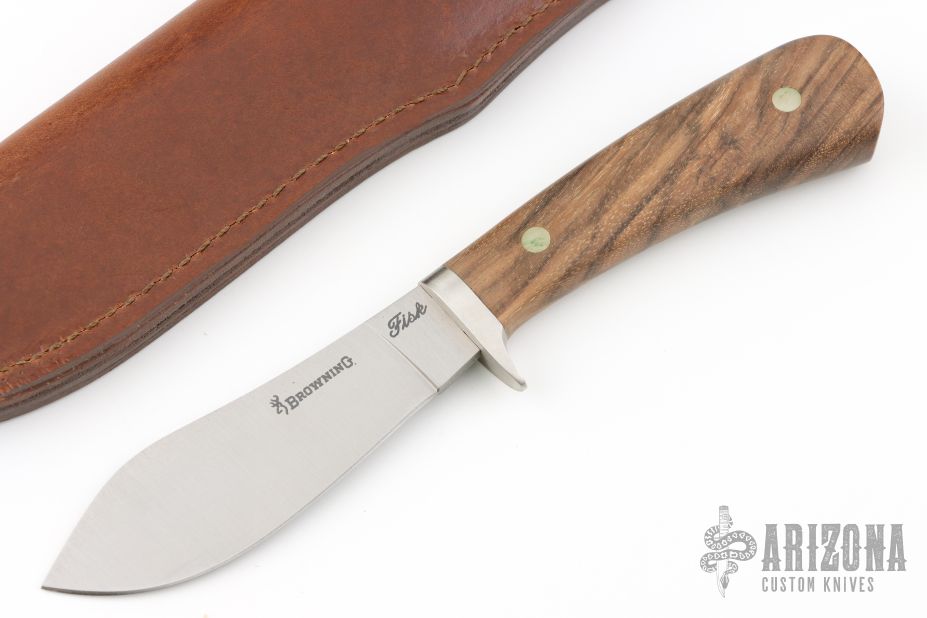 This Fisk Big Skinner by Browning Knives features some really nice looking walnut handle with stainless steel guard. Satin finished blade that is laser etched BROWNING Fisk MODEL 573 U.S.A. This knife is serial numbered #198 of only 500 made. Comes with a brown leather sheath and original box. Excellent condition.