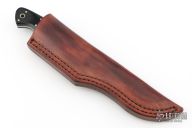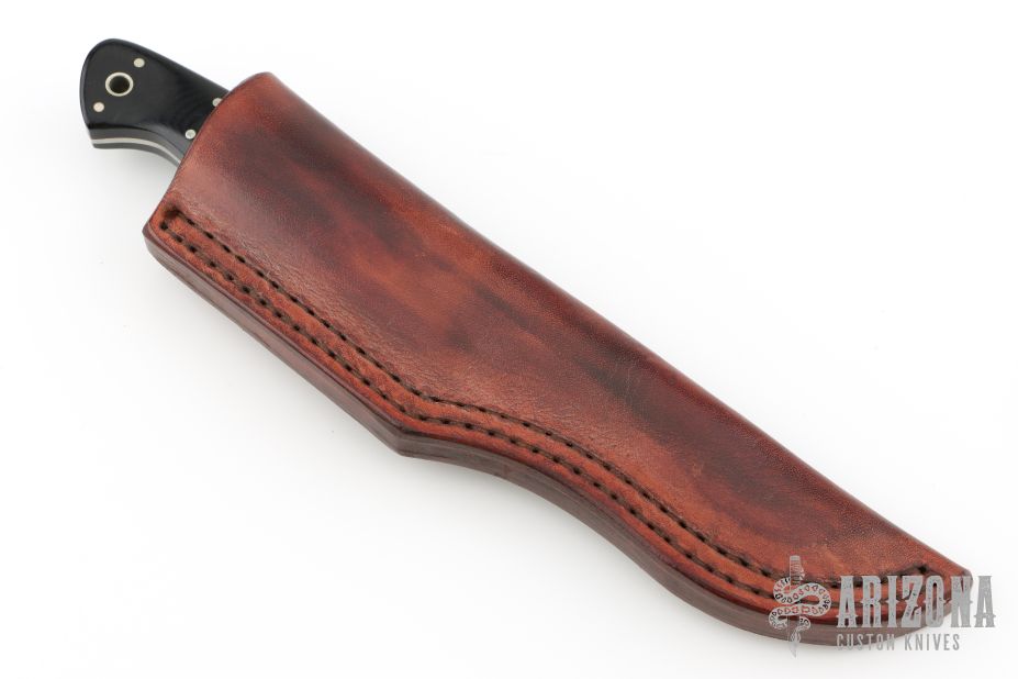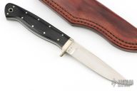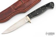 This Hunter from Fred E. Webber features a hand rub satin finished drop point blade with .126" blade stock and .817" blade depth, full tapered tang construction. The handle has a nickel silver guard with ten pinned black linen micarta scales, nickel silver pins and lanyard tube in pommel. Includes a brown leather sheath with belt loop. "31 V" on the ricasso. Has a couple of light scratches, otherwise excellent condition.