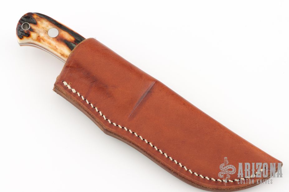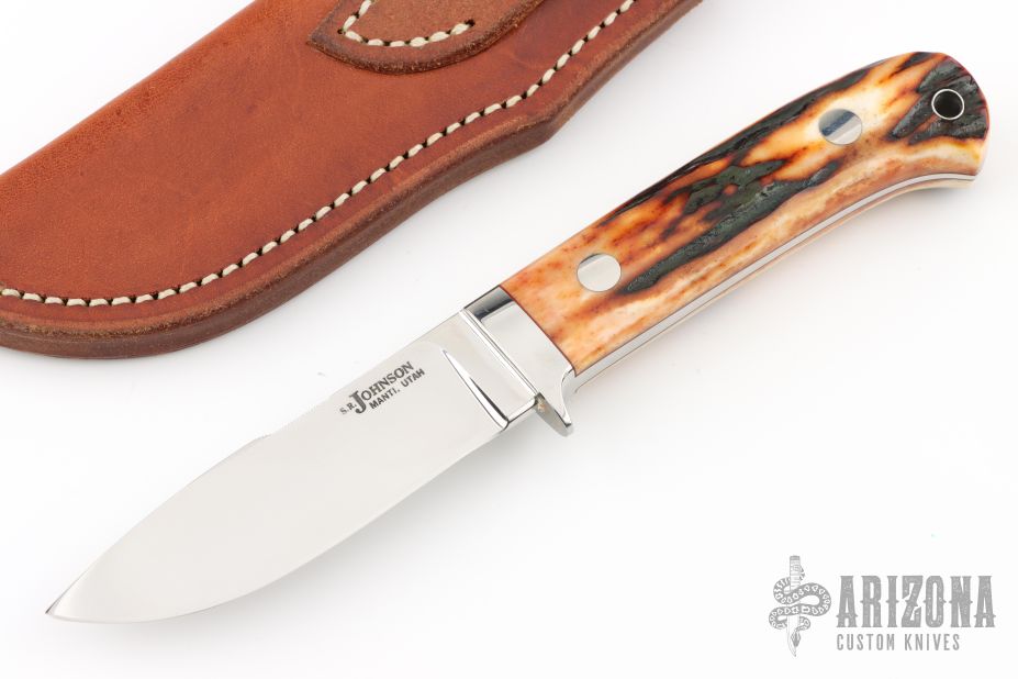 This "Bill's Drop Hunter" by SR Johnson features a mirror polished blade with notched thumbramp, .188" blade thickness and .990" blade depth, full tapered tang construction. The handle has a stainless guard, stag scales with red liners and a lanyard hole. Comes with a brown leather sheath. Great look and feel. Excellent fit and finish. Excellent condition.