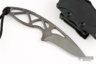 This Medallion neck knife has a black stonewashed blade with notched thumbrest, .153" blade stock and 1.120" blade depth, full skeletonized tang construction. Dated 08/2001 and s/n 0725. Comes with original kydex sheath/ball chain, and original box and papers. Has some light scuffs, and some marks on the blade. Great condition otherwise.