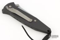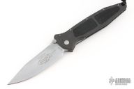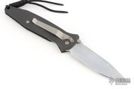 This Mini Socom by Microtech has a silver blade with notched thumbrest and dual thumbstuds. The handle is composed of black aluminum with non-slip inserts. Dated 12/98. Stainless steel clip. Includes original box, MT sheath and papers. Has some light scuffs and scratches, great condition otherwise.