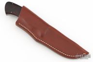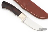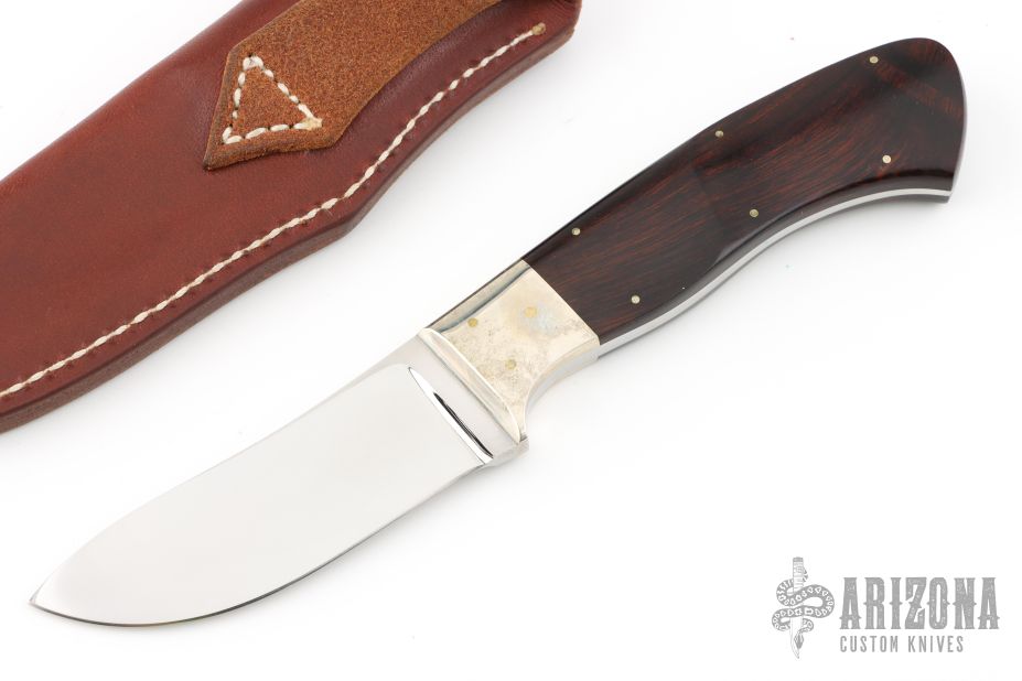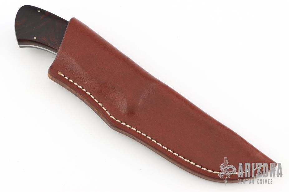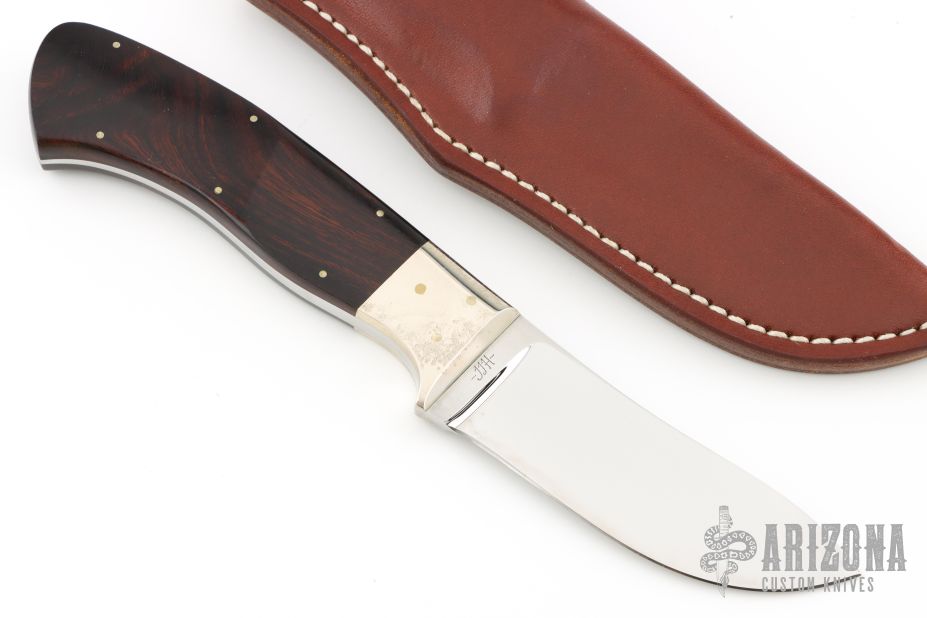 This knife by Jim Hardenbrook features a mirror polished drop point blade with .188" blade stock and 1.151" blade depth, full tapered tang construction. The handle has nickel silver bolsters with desert ironwood scales. Comes with a brown leather sheath. Excellent condition.