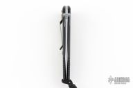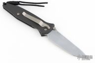 This Socom M/A by Microtech has a silver finished tanto blade with dual thumbstuds and notched thumbrest. The handle has a black aluminum frame with rubber inserts and a tip down bead blasted stainless steel clip. Dated 6/99. Includes original clam shell box, sheath, and paperwork. Has some light scuffs, excellent condition otherwise.