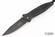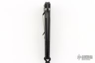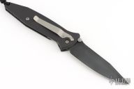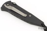 This Mini Socom M/A by Microtech has a black finished tanto blade with dual thumbstuds and notched thumbrest. The handle has a black aluminum frame with rubber inserts and a tip down bead blasted stainless steel clip. Dated 3/99. Includes original clamshell box, MT sheath, and paperwork. Has a couple light scuffs and scratches, great condition otherwise.