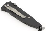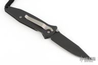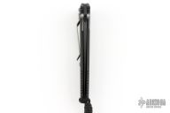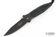 This Mini Socom M/A by Microtech has a black finished tanto blade with dual thumbstuds and notched thumbrest. The handle has a black aluminum frame with rubber inserts and a tip down bead blasted stainless steel clip. Dated 3/99. Includes original clamshell box, MT sheath, and paperwork. Has a couple light scuffs, excellent condition otherwise.