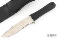 This Sog Knife features a satin finished clip point blade with notched thumbrest, and partial serrations. The handle has a steel guard, and checkered rubber grip with lanyard hole. Hidden tang construction with .155" blade stock, 1.119" blade depth. Comes with original box, and leather sheath. Has some light scuffs and scratches, great condition otherwise.