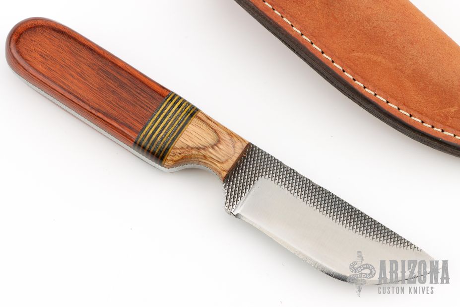 This Hunter by Anza Knives features a blade made from a file and has a fileworked spine, .205" blade thickness and 1.129" blade depth, full tang construction. The handle has wood bolsters, dymondwood scales and spacers. Comes with a brown leather sheath. Excellent condition. Dated 2010