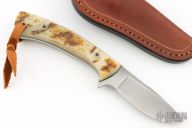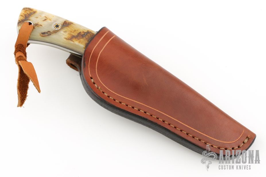 This custom knife by Keith Murr features a drop point blade with a fileworked thumbrest, .147" blade stock, 1.023" blade depth, full tang construction. The handle has sheep horn scales with black liners and mosaic pins. Excellent condition. Includes a brown leather sheath.